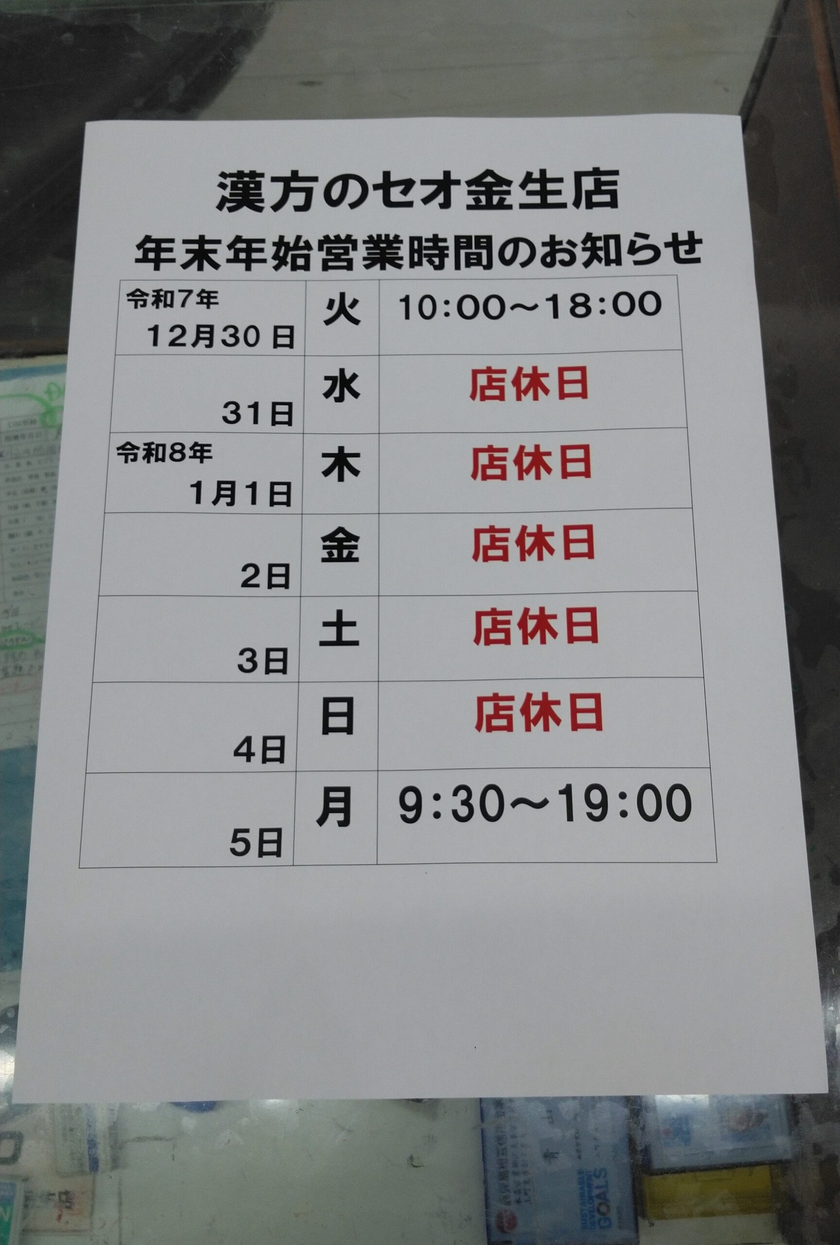 漢方のセオ金生店年末年始営業時間のお知らせ